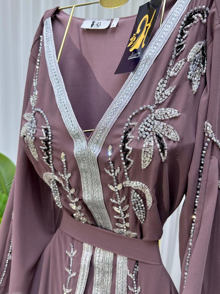 الجلابية تتميز بتصميم انيق و فاخر, الجلابية جلكسي اللون و تتكون من جلابيه مع بطانه و حزام عند الخصر ، مزينة ب تطريز يدوي كامل التطريز يتوزع على الجلابية كامله مما يضيف عليها لمسه فاخرة و مميزة