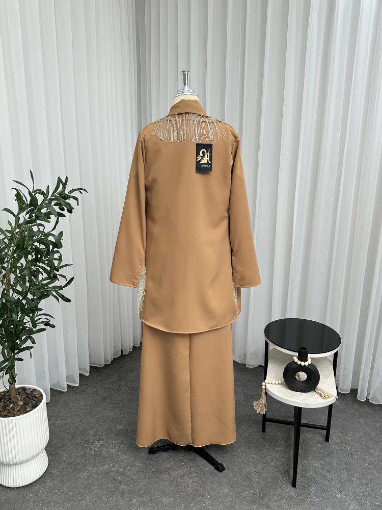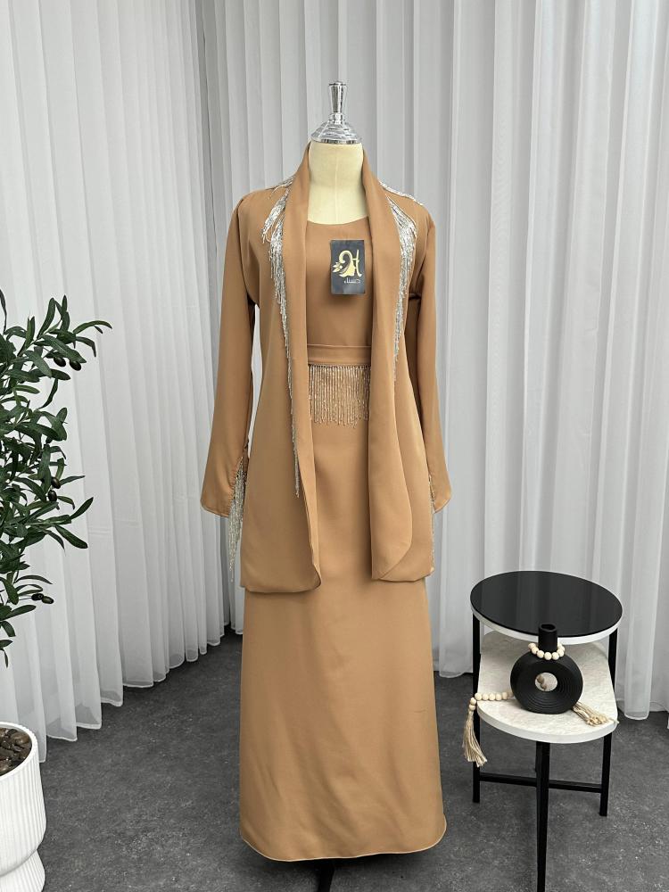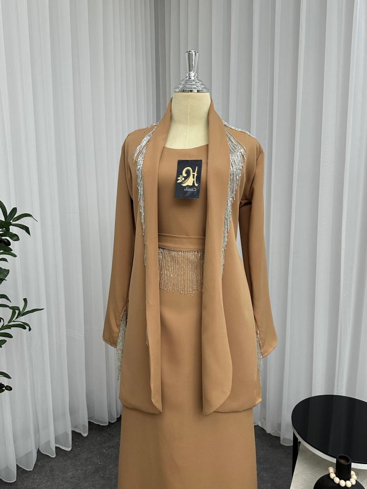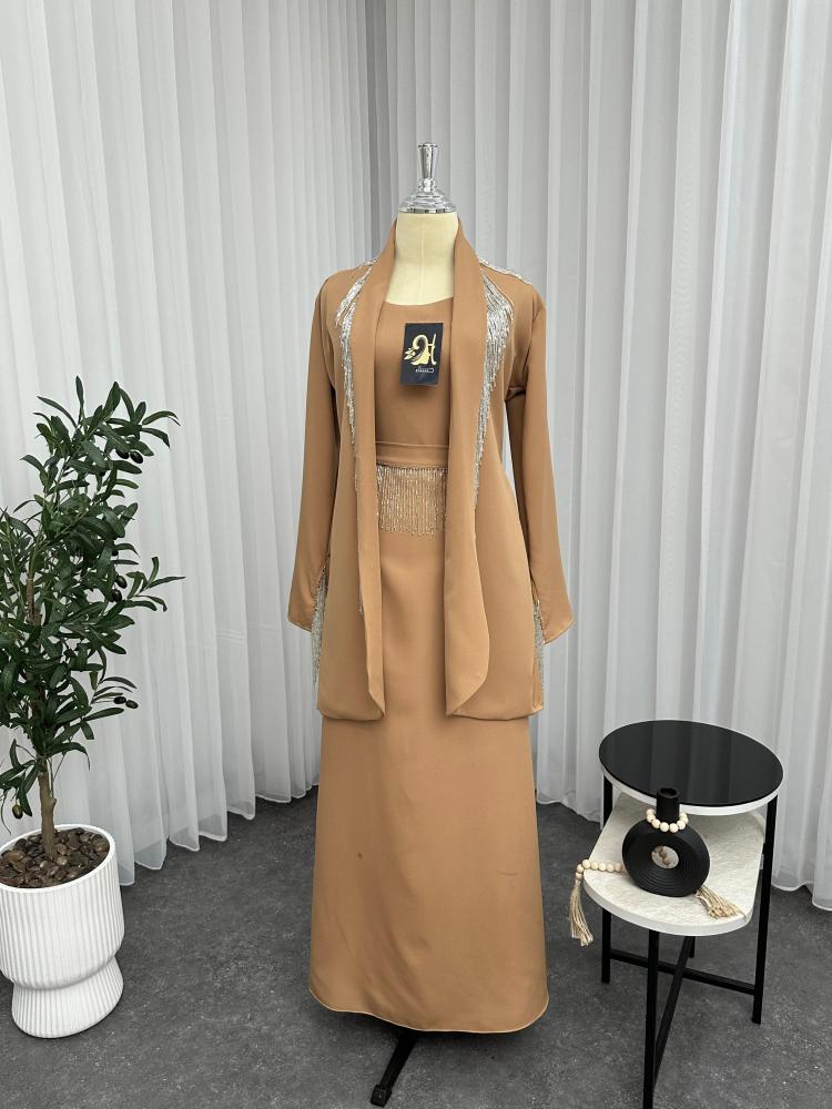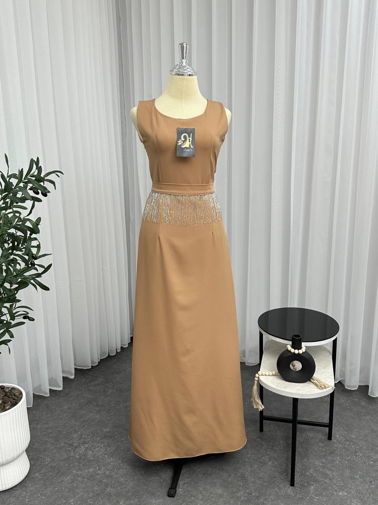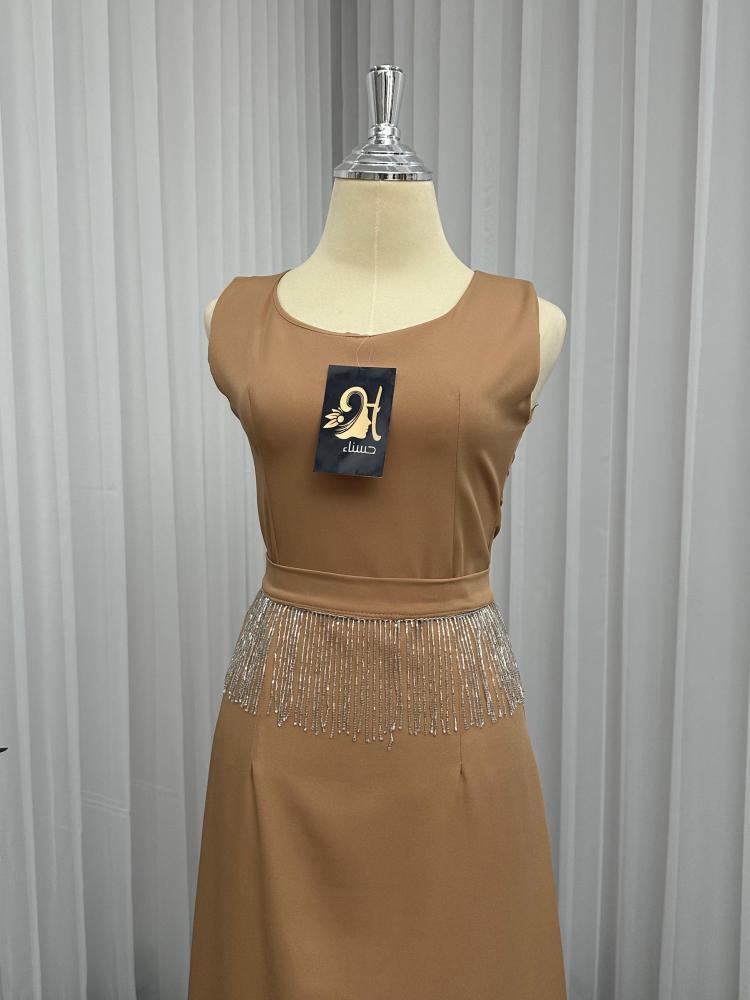 فستان يتميز بتصميم انيق و فاخر, الفستان يتكون من قطعه واحده ، يتميز ب لونه البني الذهبي الجميل مما يضيف عليها لمسه فاخرة و مميزة