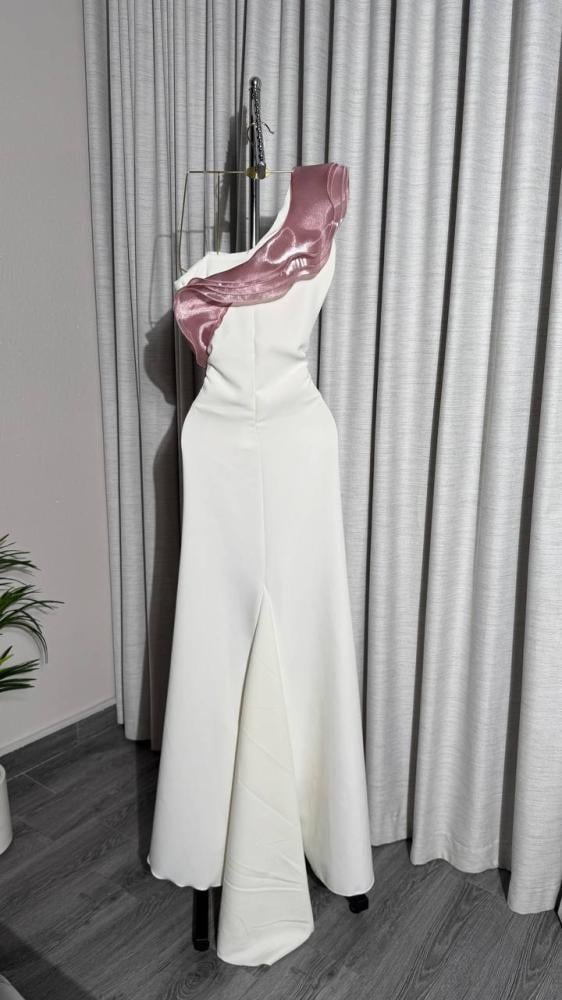 فستان أنيق بلون أبيض عاجي بتصميم كتف واحد، يزينه شريط متموج واسع من القماش الساتاني الوردي يمتد من الكتف حتى أسفل الفستان، مما يضفي عليه لمسة فنية وأنثوية فاخرة. يتميز بقَصّة ضيقة تبرز القوام وأناقة بسيطة تناسب المناسبات الراقية.