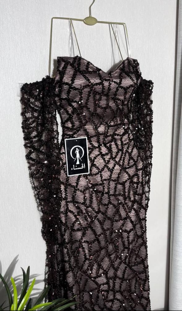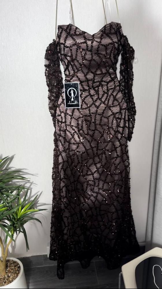 فستان سهرة أنيق بتصميم فاخر، يأتي بقماش مطرز بالترتر الأسود اللامع بنقشة هندسية فريدة فوق بطانة بلون وردي فاتح، مما يعطي تباين جميل ولمسة راقية. القصة ضيقة تُبرز القوام، والأكمام الطويلة تضيف فخامة مناسبة للمناسبات المسائية والسهرات الخاصة.