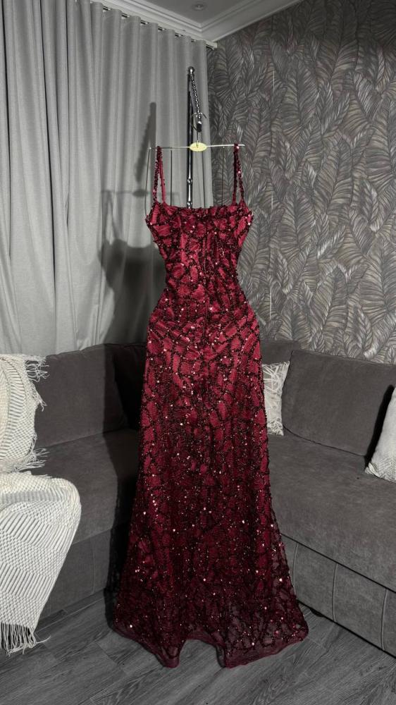 فستان سهرة أنيق بلون خمري، بتطريز لامع وتفاصيل فاخرة تضفي لمسة راقية، بقصة تبرز الخصر وانسيابية أنثوية جذابة.