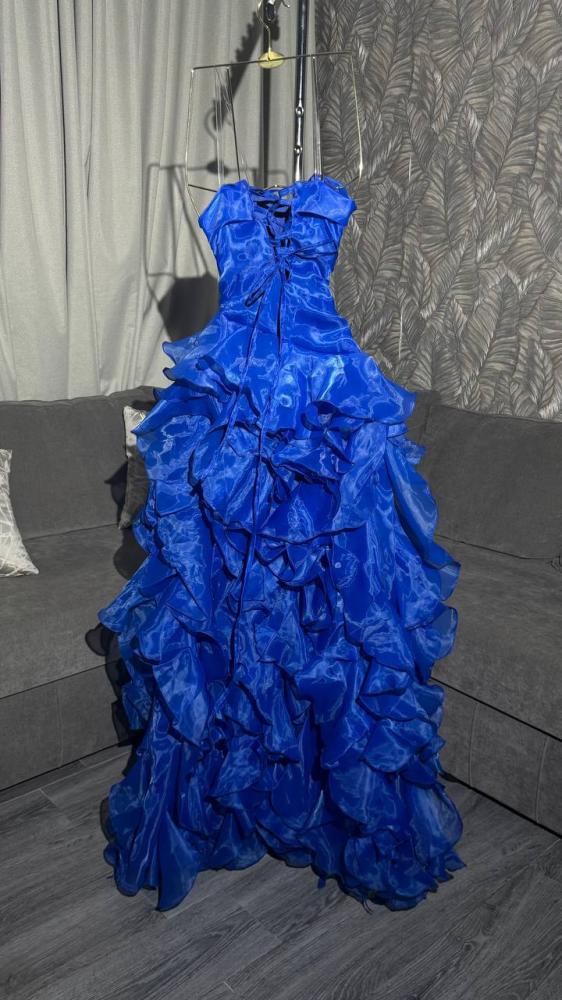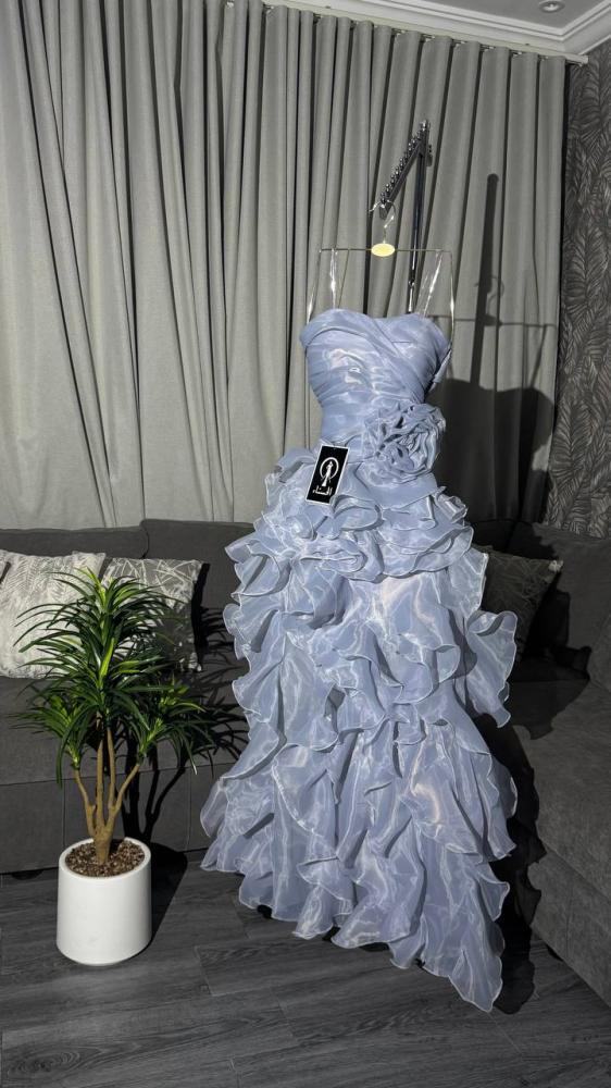 فستان سهرة أنيق بتصميم بدون أكتاف، مصنوع من قماش لامع بتفاصيل كشكش متدرجة تغطي كامل الفستان، مما يمنحه حجماً فخماً وجاذبية راقية. يزين الخصر وردة كبيرة تضيف لمسة أنثوية مميزة. يتوفر باللونين الأزرق الملكي اللامع والرمادي الفاتح، ليمنح إطلالة فخمة تناسب المناسبات الخاصة.