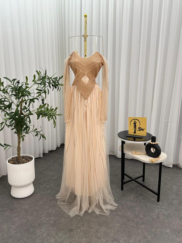 فستان يتميز بتصميم انيق و فاخر, الفستان يتكون من قطعه واحده ، يتميز ب لونه البيج وتطريزه اليدوي الجميل مما يضيف عليها لمسه فاخرة و مميزة