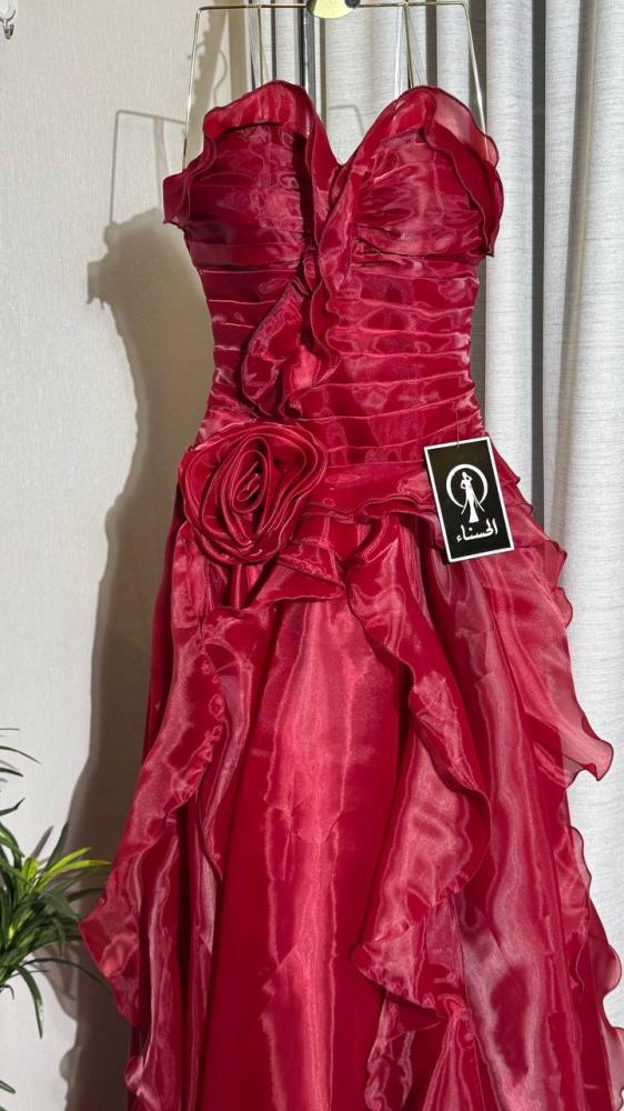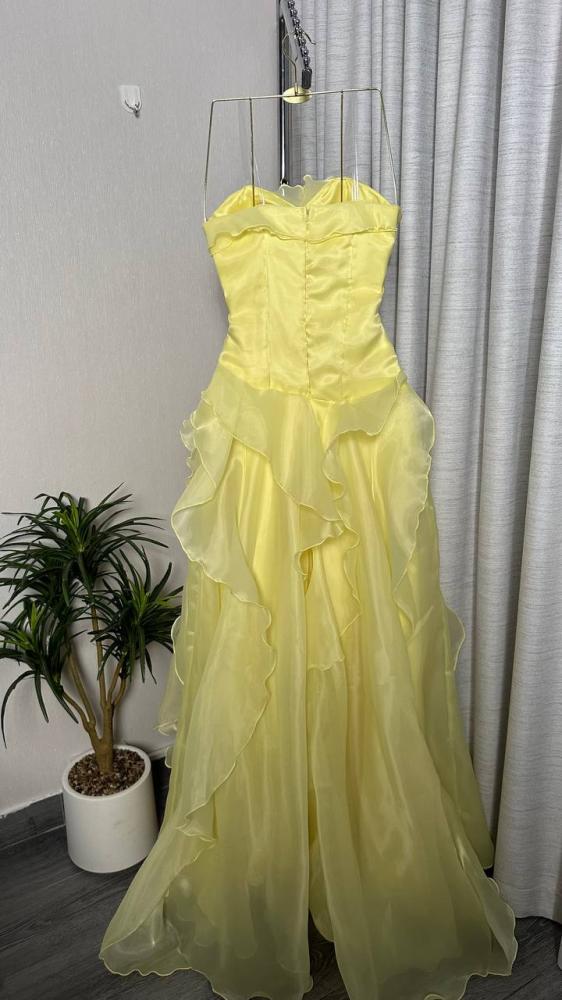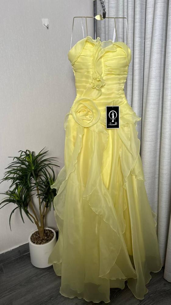 فستان سهرة أنيق بتصميم ناعم من الشيفون الطبقي، بقصة عارية الأكتاف وتفاصيل وردية جذابة عند الخصر. متوفر باللون الأصفر المشرق و احمر