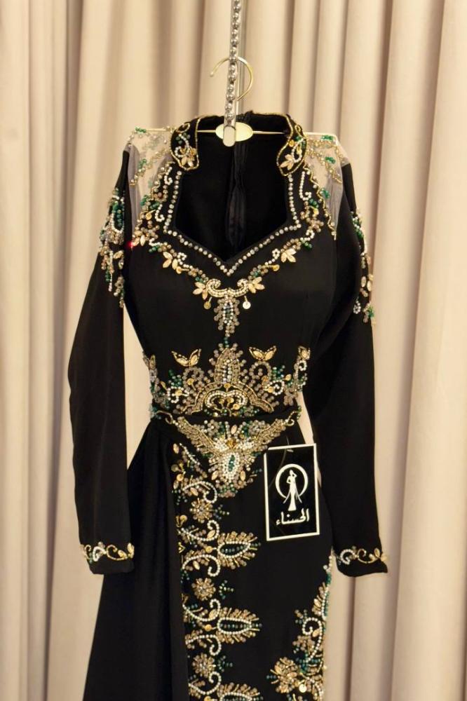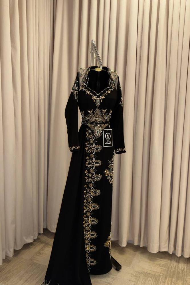قفطان مخملي أسود بأكمام طويلة، مزين بتطريز فاخر ذهبي وفضي مع لمسات حجرية لامعة، بتصميم أنيق يمتد على طول القفطان لإطلالة فخمة تناسب المناسبات.