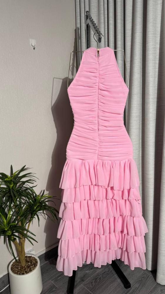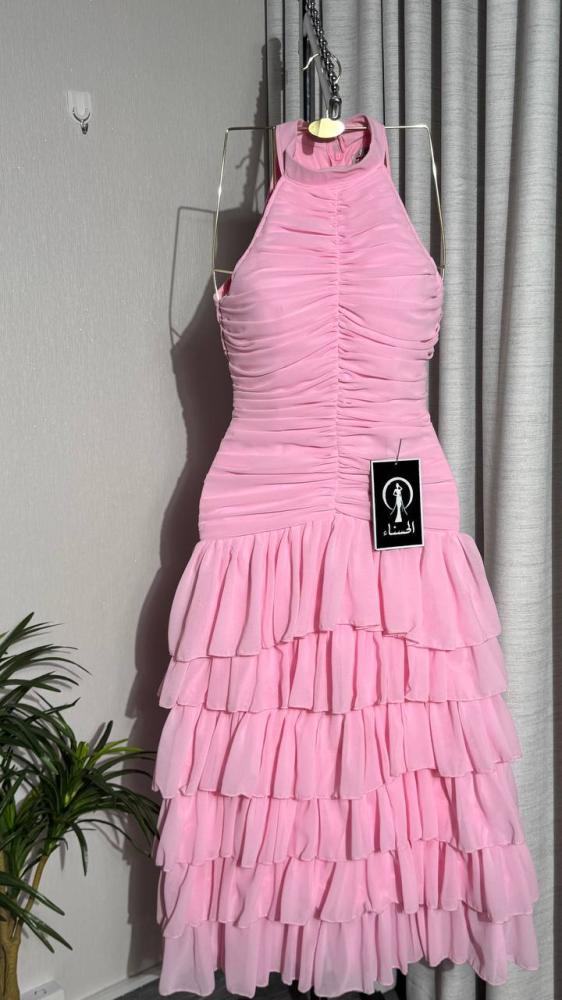 فستان سهرة قصير بلون وردي ناعم، بتصميم حمالة رقبة وتفاصيل كشكش متدرجة تمنح إطلالة أنثوية جذابة وأسلوب عصري مميز.